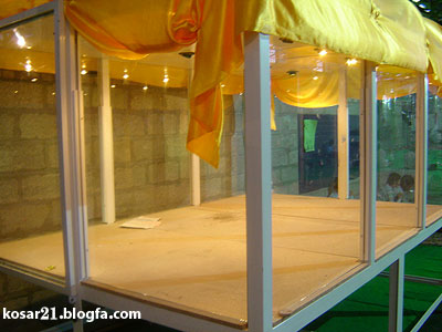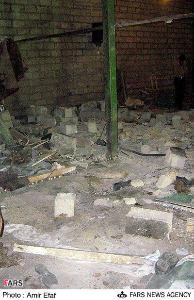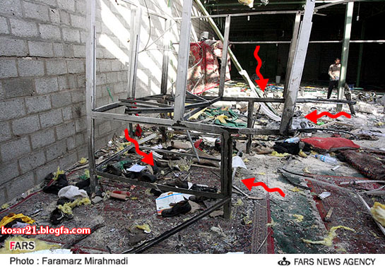 توجه کنید: فکر نمی‌کردم نیاز به توضیح داشته باشد؛ یک بار در متن ذکر شده که این محفظه بعد از انفجار، می‌افتد چند متری محل اولیه‌ی خودش؛ و بعد در جریان کمک‌رسانی و خروج مجروحین و شهدا، این محفظه انتقال پیدا می کند به کنار دیوار مجاور؛ که رو‌به‌روی محل اصلی خودش بوده است... این که می‌بینید فرش زیرش سالم می باشد به این دلیل هست که الان در محل انفجار قرار نگرفته است؛ وگرنه محل انفجار را می‌توانید با توجه به گودی‌ای که ایجاد کرده؛ در جلوی آن ستون سبز‌رنگ که دیوار کنارش فرو ریخته؛ توی این تصویر ببینید:
