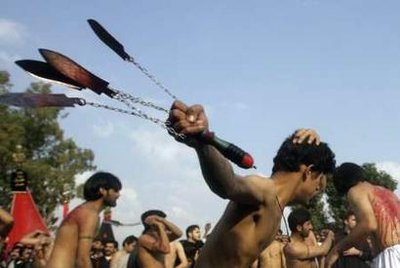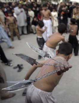 یک مسلمان شیعه پاکستانی در حال استفاده از تیغ های متصل به زنجیر در مراسم عاشورا
