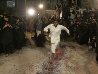 دویدن مرد مسلمان شیعه از روی ذغال های گداخته در روز عاشورا