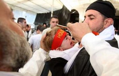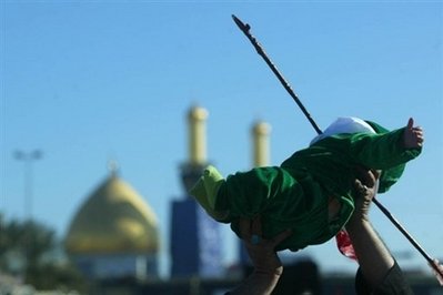 بالا نگه داشتن نوزاد در مراسم عاشورا به یاد روز کشته شدن امام حسین در کربلا