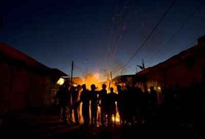 مرد ایرانی پوشیده شده از گل , ایستاده در کنار آتش برای خشک شدن