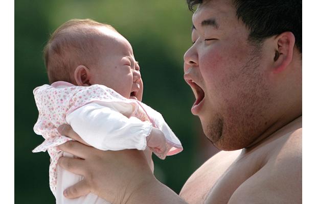 ترس و گریه کودک کوچک ژاپنی از کشتی گیر آماتور سومو.
