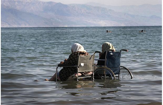 لذت بردن دو زن سالخورده فلسطینی در ساحل شمالی دریای بحر المیت از برخورد امواج