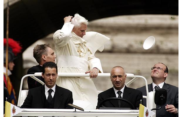 باد کلاه پاپ بندیکت شانزدهم را در مراسم عمومی در میدان سنت پیتر واتیکان , با خود برد.