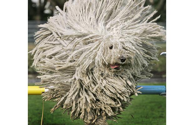 سگ گله مجارستانی , در لحظه پریدن از میله ها در طی یک مسابقه نمایشی سگ ها در دورتموند آلمان
