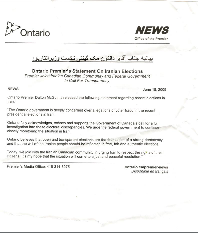 این تجمع 1500 نفره در روز 21 ژوئن از ساعت 2 تا 4.30 دقیقه بعدازظهر در مقابل پارلمان انتاریو در تورنتو برگزار شد و در طی آن رضا مدیری اولین نماینده ایرانی الاصل پارلمان و همین طور دالتون مک گینیتی به سخنرانی پرداختند.