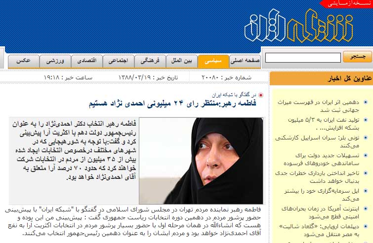 البته به نظر نمیرسه که این خانم از قبل میدونسته که قراره وزارت کشور رای احمدینژاد رو 24 میلیون اعلام کنه چون اگر میدونست اینقدر تابلو نمیکرد |