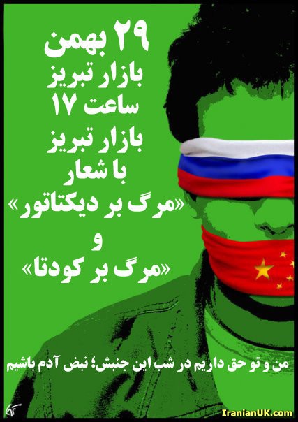 شبکه جنبش راه سبز(جرس): همزمان با قیام خونین مردم تبریز، سبزهای این شهر در 29 بهمن ماه گرد هم می آیند.