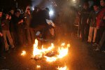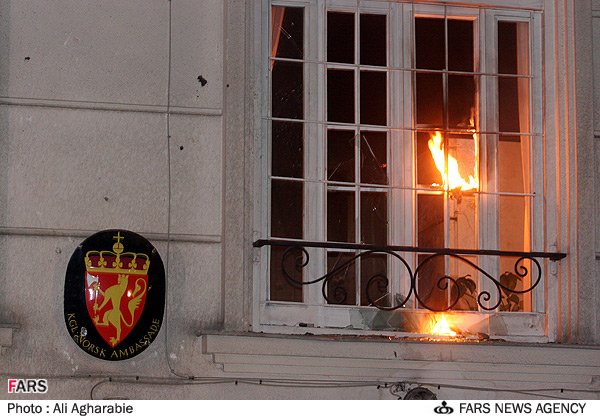 تصاویری از تجمع بسیجیان در برابر سفارت نروژ در تهران و به آتش کشیدن تابلوی سفارت در حضور دکتر غفوری فرد نماینده مجلس