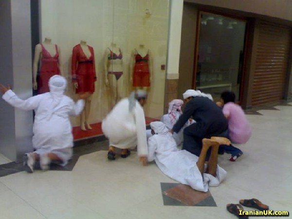 یا ابوالفضل العباس ,اینا میخوان ویترین مغازه رو بشکنن برن داخل.عکس دومو خوب نگاه کنید عربه دست زده به شیشه داره التماس میکنه میگه ای خدای رحمانو رحیم ,ای افریننده همه مخلوقات تو را شکر می کنیم که فرشته های سکسیت را برای هدایت ما عربها فرستادی تا از بند جهل و نادانی رها شویم...........البته نگران نباشید تا فردا تمام این مانکنها به دست عربها دزدیده می شه و در خانه به جای مهرو سجاده به پاش نماز میخو نن , بعد از نماز بجا ی فیلم اونو نگاه میکنن , وقت خواب هم که انو بجای ذیفه میبره تو تختو تا صبح تو گوشش قران میخونه تا صیقه محرمیت جاری بشه.اینم از خدمات رایگان خدا به بندگان ندید بدیدش,