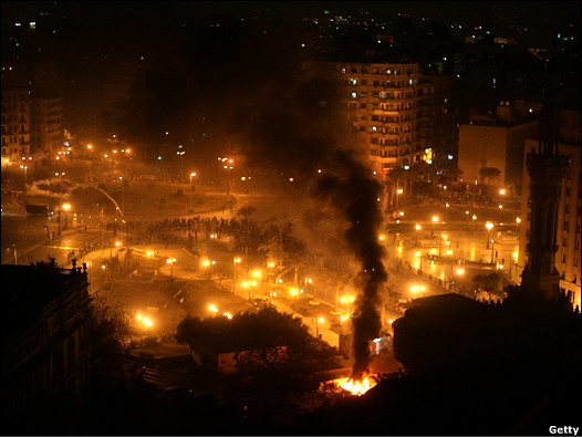 معترضان کمی پس از اعلام برقراری مقررات منع رفت و آمد در قاهره، دفتر مرکزی حزب دموکراتیک ملی، متعلق به حسنی مبارک را به آتش کشیدند.