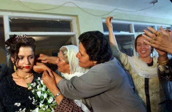 مادر و مادربزرگ عروس در حال آویختن گوشواره به عروس در کابل هستند. بعد از دوران طالبان سالن های ازدواج دوباره بازگشایی شد و شادمانی و بوق زدن ماشین عروس و همراهانشان در خیابانهای کابل بار دیگر رواج یافت ولی قانونی برای منع ازدواج کودکان تصویب نشد.