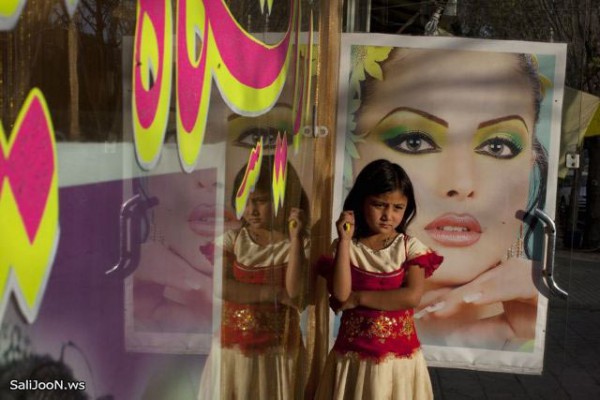 دختر بچه کوچکی در حال فروش آدامس در کنار یک سالن آرایش عروس در کابل. پشت این پرده های محصور شده با پرده ها عروس ها ساعت ها برای مراسم ازدواج آماده می شوند. این دختر آدامس فروش در چه سنی متاهل می شود؟!