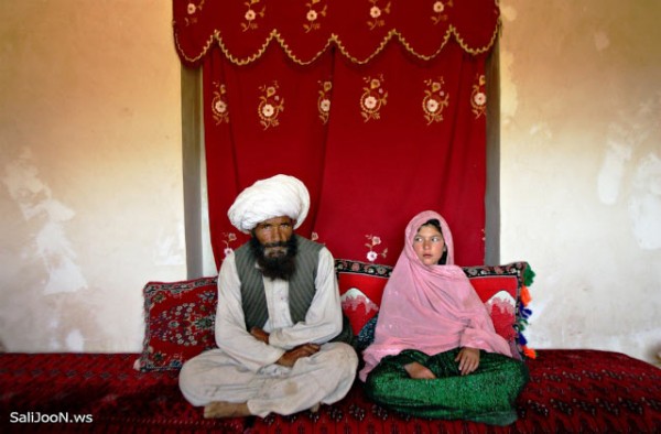 بنا به آمار یونیسف حدود ۵۰ میلیون دختر زیر ۱۷ سال در کشورهای در حال توسعه مجبور شده اند متاهل شوند. پدیده ازدواج کودکان در افغانستان بویژه در مناطق روستایی شایع است. ۵۷ درصد از دختران افغان قبل از رسیدن به سن ۱۶ سالگی عروس می شوند و آمار مرگ آنان به علت حاملگی زودرس بسیار بالاست. در عکس فوق سعید محمد ۵۵ ساله با روشن کاظم ۸ ساله در مراسم نامزدی دیده می شوند. پدر عروس، عبدل کاظم ۶۰ ساله با بیان اینکه راضی به این ازدواج نبوده اما فقرشدیدمجبور به رضایت وی برای این ازدواج شده است.