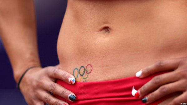 هیلیس فانتین، نماینده آمریکا در رقابتهای دوومیدانی هفتگانه زنان در بازیهای المپیک لندن حلقههای المپیک را در پهلویش خالکوبی کرده است
