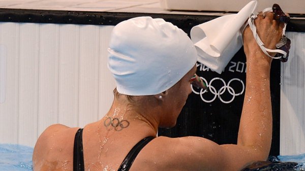 ملانی نوشر، شناگر ایرلندی، حلقههای المپیک را پشت گردنش خالکوبی کرده است.