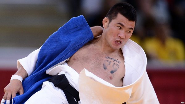 ورزشکار مغولستانی حاضر در رقابتهای جودوی المپیک روی سینهاش خالکوبی رد دو پا و واژه "قهرمان" را دارد.