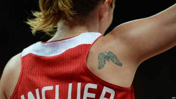 اسمرآل تونچلوار، یکی از اعضای تیم بسکتبال زنان ترکیه روی شانهاش یک پروانه خالکوبی کرده است. این عکس در جریان بازیهای مقدماتی گروه A مسابقات بسکتبال المپیک لندن ثبت شده است.