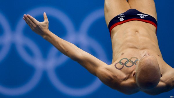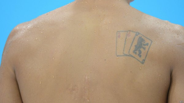 عکاس خبرگزاری فرانسه این تصویر از خالکوبی یک شناگر حاضر در رقابتهای المپیک را دو روز پیش از آغاز رسمی مسابقات و زمانی ثبت کرده است که او در یکی از استخرهای ورزشی لندن در حال تمرین بود.