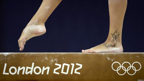 ونسا فراری، عضو تیم ژیمناستیک زنان ایتالیا طرح یک پروانه را روی مچ پایش خالکوبی کرده است. این عکس در جریان تمرینات او در لندن و قبل از آغاز رسمی مسابقات المپیک ثبت شده است.