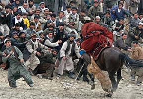 یک شرکت کننده در مسابقات بزکشی در کابل افغانستان بعد از تصاحب بدن بز از رقیب خود، به حدی سرذوق آمد که ناگهان وارد جماعت تماشاچیان شد و چند نفر از آن ها را نیز با اسب و بزی که در دست داشت، کشید.