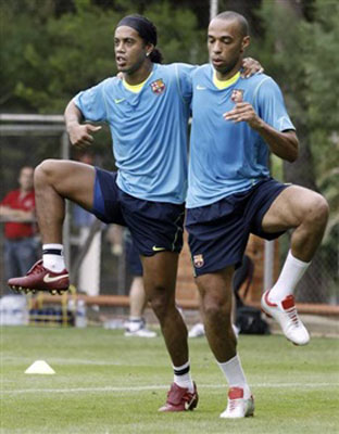 رونالدینیو (چپ) و تیری هانری (راست) در تمرینات بارسلونا