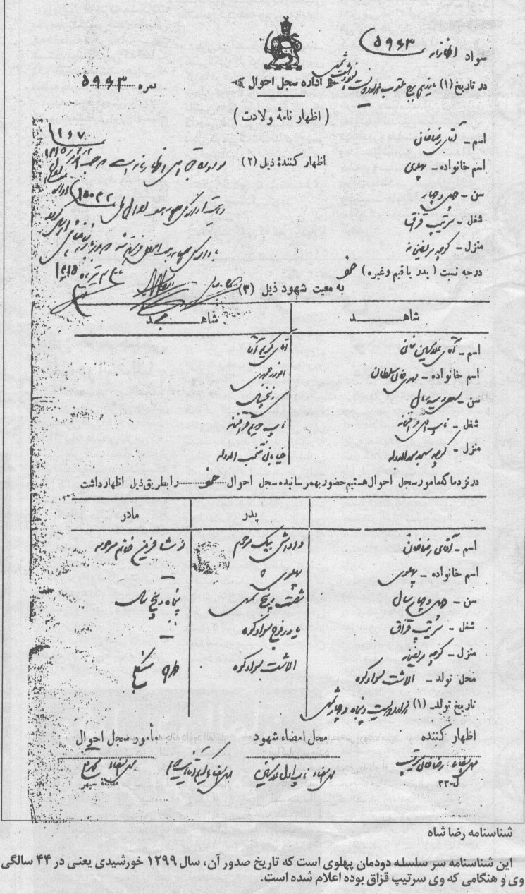 تصویری از شناسنامه یا سجل رضا شاه پهلوی