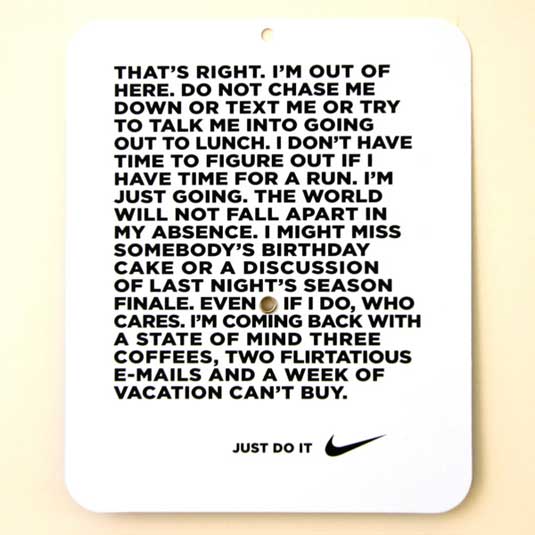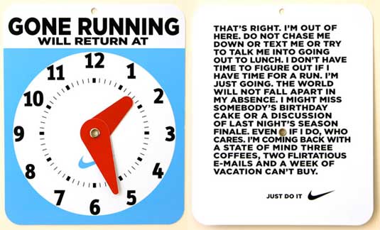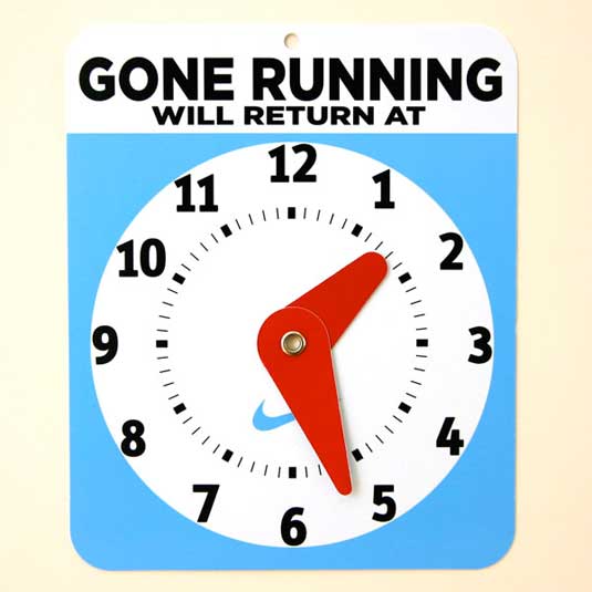 در یکی از فروشگاه های نایک (Nike) در فرودگاه Portland و برخی فروشگاه های دیگر در آمریکا، علامت هایی به شکل بالا به طور رایگان به مردم می دادند. این علامت ها، همانطور که می بینید، یک ساعت است که عقربه های آن قابل حرکت است. روی آن نوشته شده است: رفته ام بدوم، ساعت ___ بر میگردم. شما می توانید ساعت برگشتتان از دویدن را در این ساعت نشان دهید. من همیشه از تبلیغات نایک لذت برده ام، چون ایده های بسیار جالب و خلاقانه ای دارند و با بقیه کاملا متفاوت هستند.