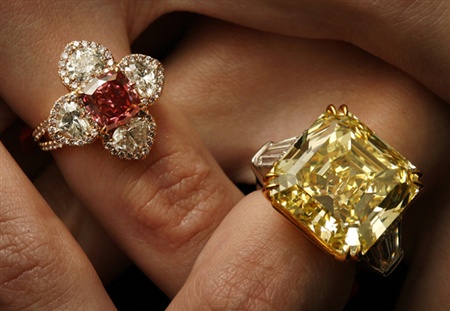 سمت چپ انگشتر الماس مایل به ارغوانی با وزن ۲.۲۶قیراط و سمت راست انگشتر۳۱.۴۷ قیراتی از الماس زرد.این انگشتری ها در ۱۵نوامبر به حراج گذاشته میشوند وانتظار این است که به قیمت بین1,310,000 تا 1,638,000دلار و 1,965,000 تا 2,401,000 بفروش برسند.