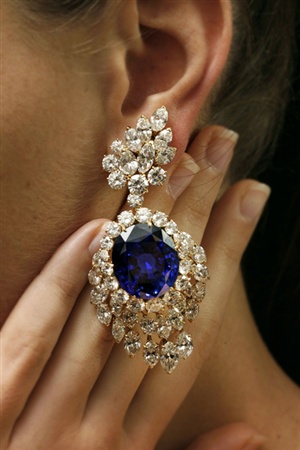 مدلی از کریستی یک جفت گوشواره با ۵۲.۷۲قیراط یاقوت کبود و۴۹.۸۴ قیراط الماس که پیش بینی میشود در حراج نیمه نوامبر به قیمتی بین ۱۰۹۲۰۰۰ تا ۱۸۷۵۰۰۰ دلار به فروش برسد.
