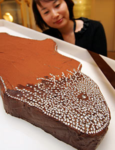 و این خانم ژاپنی به قطعه شکلاتی نگاه میکند که روی آن با ۲۰۰۶ قطعه الماس تزئین شده .قیمت این شکلات ۲.۲۵ میلیون پوند استرلینگ میباشد.