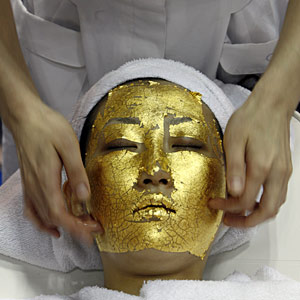 ماسک زیبائی صورت با ترکیب ۲۴ قیراط طلا .استفاده شده توسط Umo Inc در توکیو که به ماسک طلائی معروف است قیمتی معادل ۱۲۵ پوند دارد.
