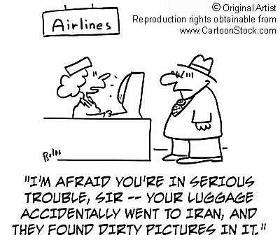 به مسافر بدبخت میگه : ببخشید , متاسفانه شما توی یه دردسر جدی افتادید. چمدون شما تصادفی رفته ایران و اونها هم توش عکسهای ناجور پیدا کردند.
