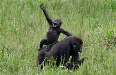 یه میمون ، سوار کول یه گوریل شده و داره در مورد مدیریت جهان ، فریاد می زنه !