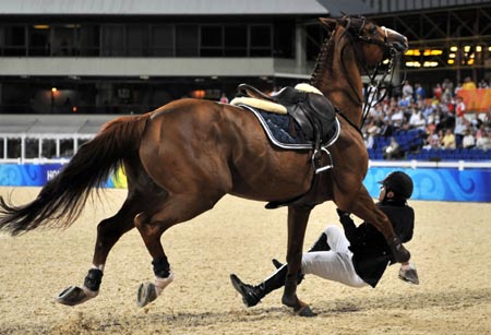 جمال رحیمف سوارکار آذربایجانی در جریان پرش از مانع انفرادی المپیک از اسبش لونسکا دو برکا سقوط کرد.