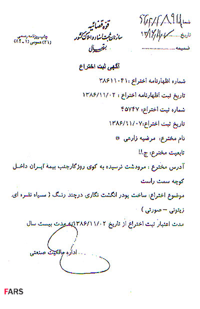 مرضیه زارعی پودر انگشتنگاری را طبق گواهینامه ثبت اختراع به شماره دفتر ثبت اختراع 45747 به ثبت رسانده است.