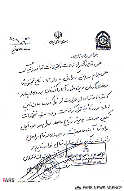 گزارش شکایت مرضیه زارع از نیروی انتظامی در خبرگزاری فارس به تاریخ اول خرداد 1387