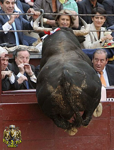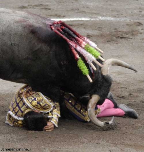 قیافه اون یارو که گاو از دیوارخ تماشاچیا بالا رفته خیلی باحاله...انگار داره خودشو میخوره!!