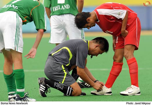 دوستان این یکی از صحنه هایی هست که من تا عمر دارم از یاد نخواهم برد. مسابقه فوتبال پارا المپیک پکن و مسابقه بین تیم های ایران و ایرلند بود و وقتی بند کفش یکی از بازیکن های ایرانی باز شد و داور میدونست که بازیکن قادر به بستن بند کفشش نیست بازی متوقف شد و داور خودش زانو زد و بند کفش رو بست . به نظر من این عکس باید برنده جایزه بشه البته این نظر منه .