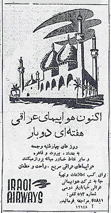 بیشترین اگهی که توجهم رو جلب کرد خطوط هوایی عراقی بود. این نشاندهنده سیاست قوی خارجی اون دوران هست. البته سیاست خارجی رژیم فعلی هم غنی هست از اورانیوم تو خالی گرفته تا صادرات اخوند و ترور در اقصی نقاط جهان که متاسفانه عامه کم ااطلاع مردم اونرو کمک مالی به اعراب می پندارند. من در عجبم که ایا یک اخوند فاسق خودپرست می تونه جاندار دیگری رو ولو به قول برخی عربستیز یک عرب رو مورد عنایت نداشته اش قرار بده.به هر حال دوستان مطمئن باشند که این رژیم منفور تمامی اعراب عدالتخواه علی الخصوص عراقیهای عزیز هست که خون بسیاری از عزیزانشون برای ارضای نفس پلید این همیشه جانیان تاریخ ریخته شد.