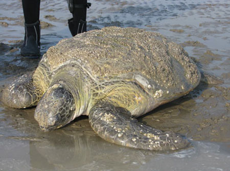 با حضور گروه امداد در محل، مشخص شد این لاک پشت 130 سانتیمتری که 200 کیلو وزن داشت هنگام مد خود را به ساحل رسانده اما پس از جزر، بهدلیل فاصله زیاد تا دریا در گل و لای ساحل گیر کرده و به همین دلیل قادر به بازگشت به دریا نیست.