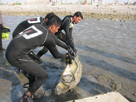 لاک پشت دریایی 200 کیلویی که بر اثر جزر و مد دریا به سواحل بندرعباس کشانده شده و در میان گل و لای ساحل گرفتار شده بود توسط آتشنشانان به دریا بازگردانده شد .