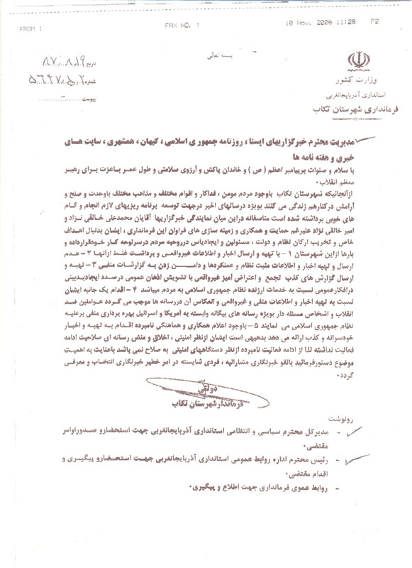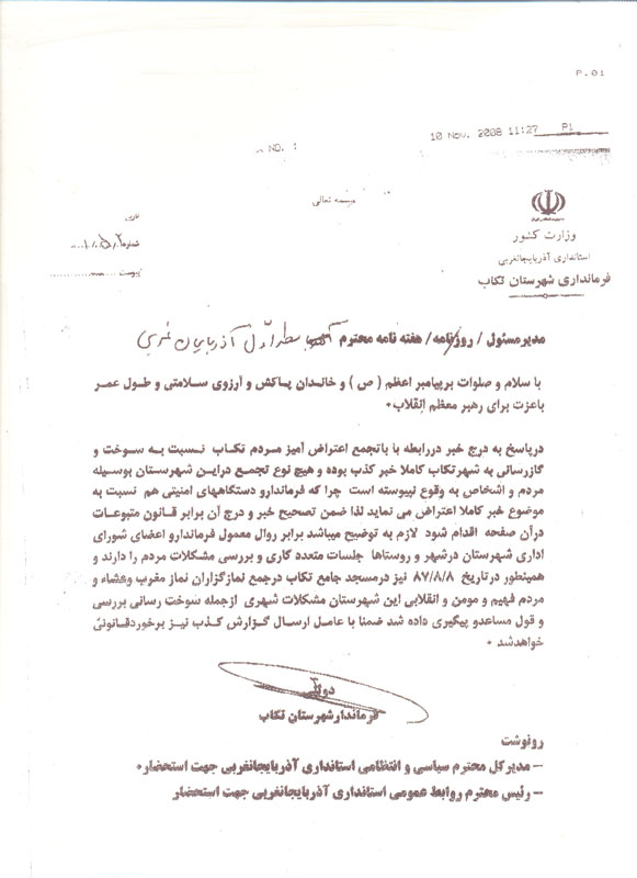 در پی انتشار گزارشی در خصوص تجمع مردم تکاب در اعتراض به وضعیت سوخت و گازرسانی به این شهرستان، فرماندار تکاب طی نامه هایی آکنده از غلط های املایی و انشایی، از یک سو خبر هر گونه تجمع را تکذیب کرده و از سوی دیگر از حضور مسوولان در جمع مردم برای پیگیری مشکل سوخت و قول مساعد آنها به مردم خبر داد!