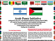 طرح صلح عربی در اصل توسط عربستان سعودی تنظیم شد و اتحادیه عرب در نشست سال 2002 در بیروت آن را پذیرفت و در سال 2007 در ریاض آن را بار دیگر مطرح کرد.