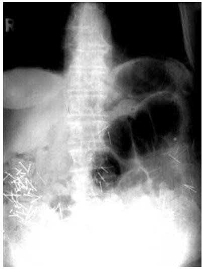 بعد از مراجعه به پزشک در رادیوگرافی که از شکم این فرد گرفته شده است 30 عدد سنجاق ته گرد و 48 عدد میخ در شکم این فرد مشاهده می شود. با درمان دارویی و رژیم غذایی پزشکان موفق به خارج کردن میخ ها و سوزن ها می شوند البته این فرد دو ماه بعد به علت سکته قلبی فوت می کند. متعاقب مرگ این فرد فرزندان وی ضمن شکایت خواستار بررسی علت فوت و بررسی هرگونه ارتباط احتمالی بین مرگ ایشان با اقدامات انجام شده توسط همسر وی می شوند. اما بعد از کالبد شکافی شواهدی که ارتباط میان این دو را ثابت کند به دست نیامد.