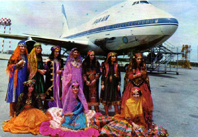 مهمانداران هواپیمایی ایران با لباس های سنتی ایران به مناسبت دریافت اولین بوئینگ 747 اس پى و برقرارى خط هوایى تهران - نیویورک -1355