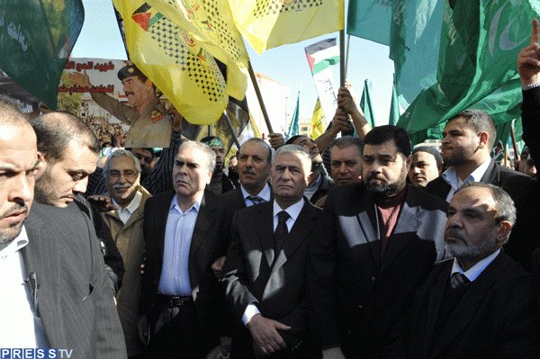 اسامه حمدان نماینده حماس در لبنان در کنار عباس زکی نماینده جنبش فتح در لبنان در تجمع اعتراضآمیز در برابر ساختمان سازمان ملل در بیروت اون هم با پوستر صدام حسین که .بر روی تصویر نوشته شده: «شهید راه بزرگترین حج، صدام حسین مجاهد»!