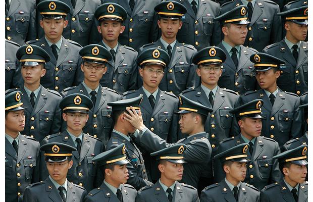 فارغ التحصیل آکادمی نظامی کلاه دوستش را برای یک عکس دسته جمعی مرتب می کند. تایوان