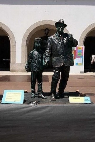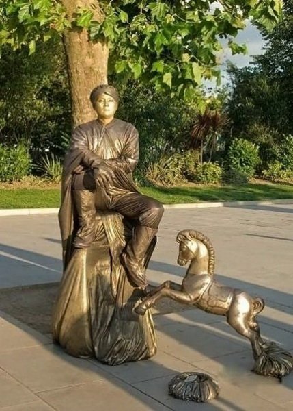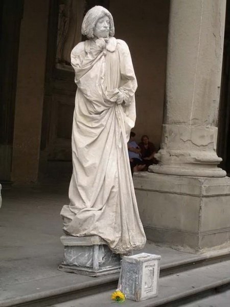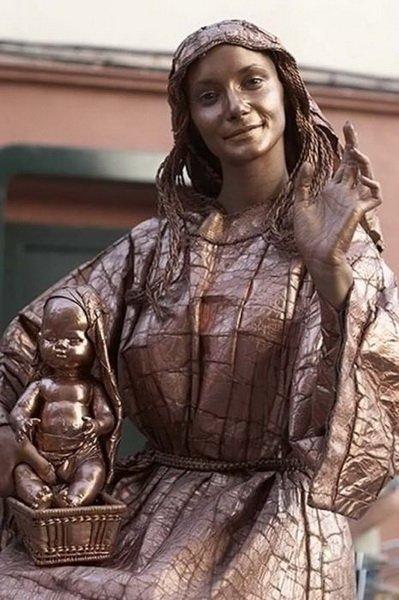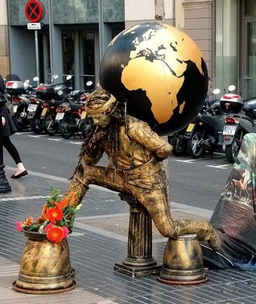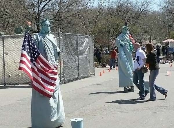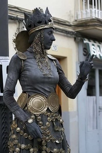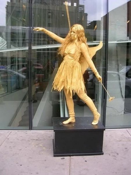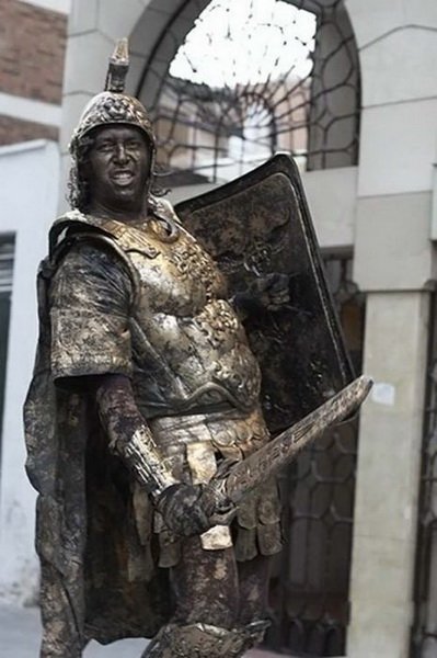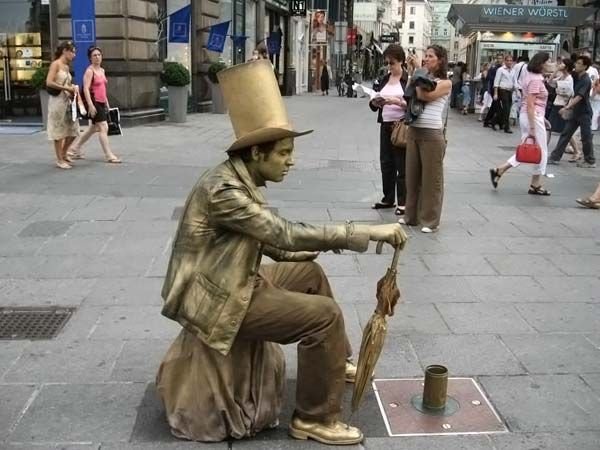 مگه در ایران نیست؟؟؟اینها مجسمه نیستند ادمهای زنده که خود را به شکل مجسمه رنگ کرده اند البته اسان نیست ساعتها بی حرکت می ایستند تا پولی را به دست اورند.. و هنرمند.