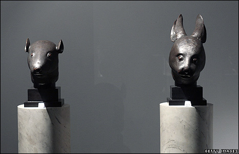چین شکایتی حقوقی را برای متوقف کردن فروش این دو مجسمه سر موش و خرگوش مطرح کرده است. چین اعلام کرده که این دو اثر 150 سال پیش از چین به غارت برده شدند. انتظار می رود این دو قطعه برنزی تا 10 میلیون یورو به فروش برسند.